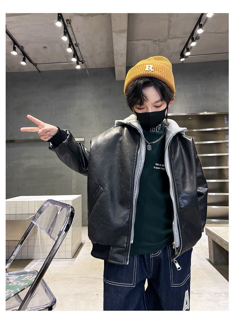 キッズ秋冬新作 子供服少年 裏ボア裏起毛 PU革 フード付ジャケット ブルゾン 重ね着風
